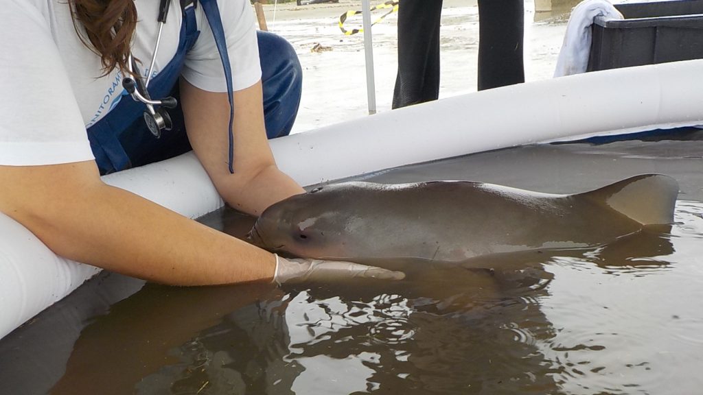 A toninha (Pontoporia blainvillei) foi estabilizada em piscina inflável e solta no mesmo dia